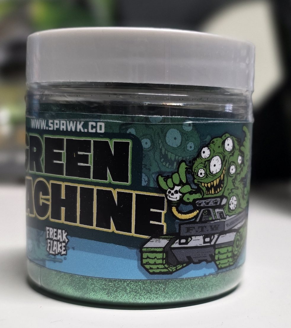 Green Machine is a vibrant green automotive flake that packs serious shine, flawless finish, and bold depth. This flake keeps your paint job dancing with energy and attitude. Available in 4oz jar.