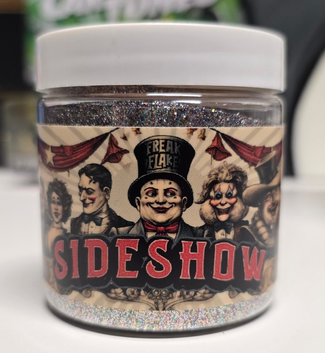Sideshow is a wild multi-colored full spectrum automotive grade flake that delivers electrifying shine, smooth finish, and vibrant depth. This flake keeps your paint job dancing like a true showstopper under every light. Available in 4oz. jars.